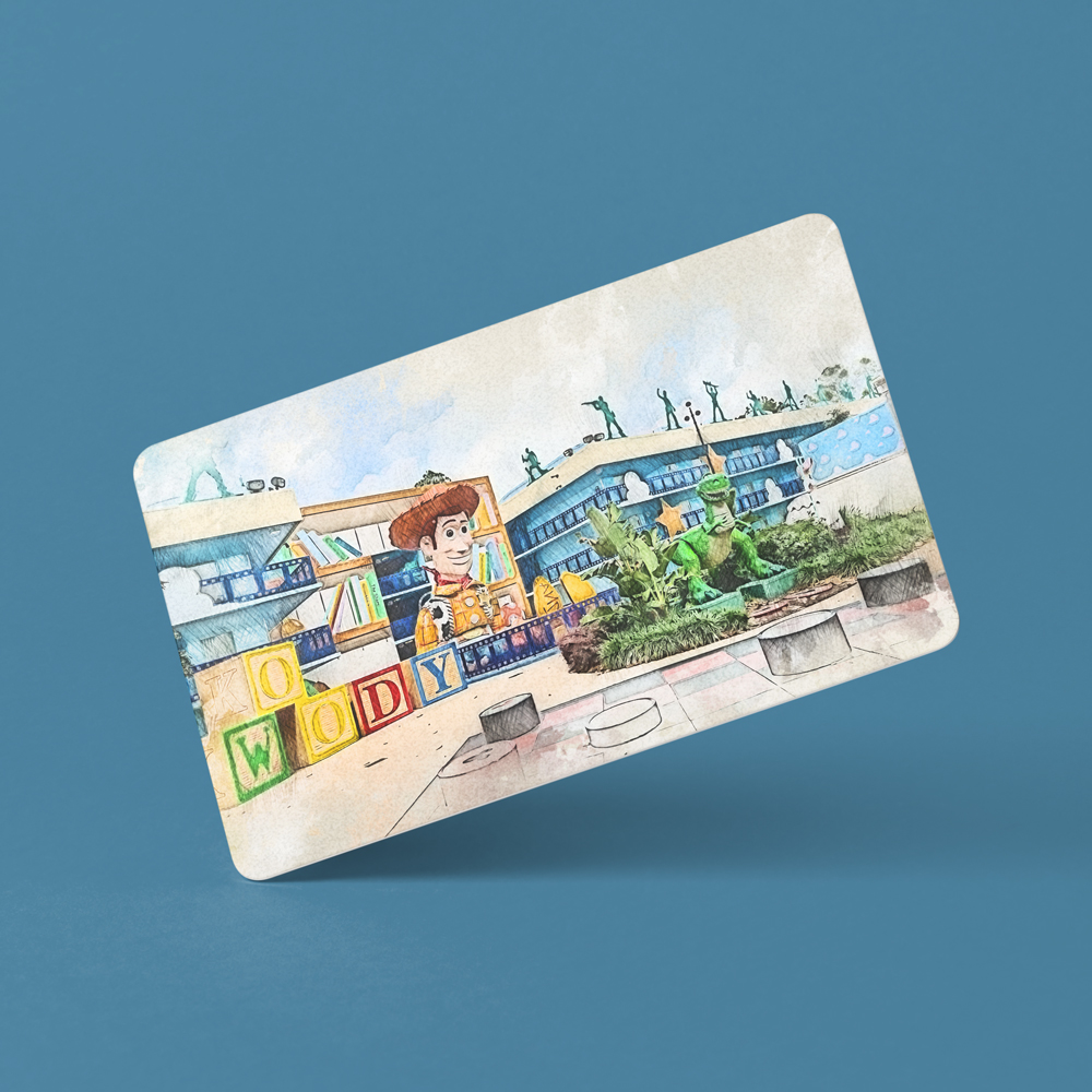 This custom watercolor sketch artwork featuring the All Star Music Resort is printed in full-color on a plastic substrate the same size as a credit card and is mounted on a magnetic backing.