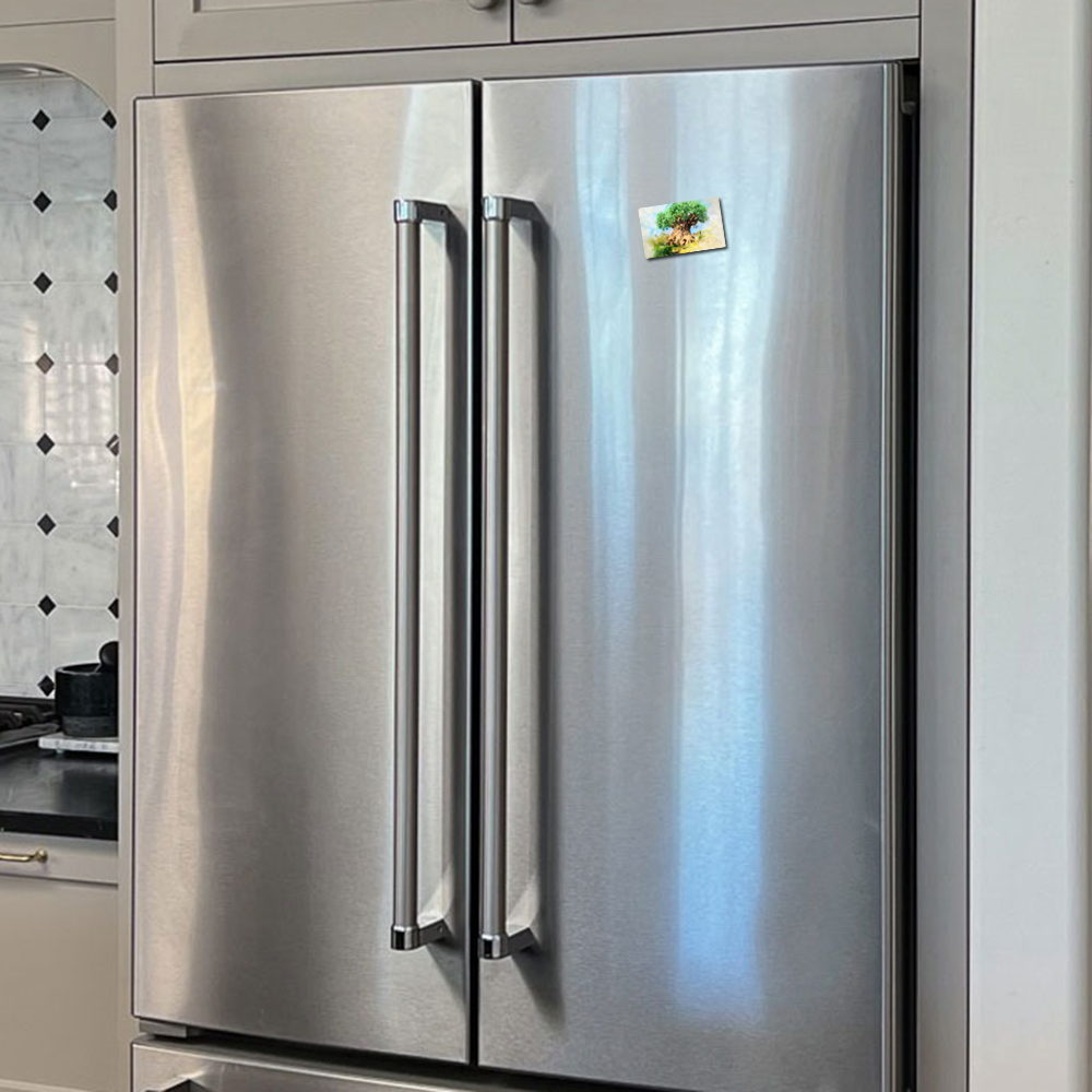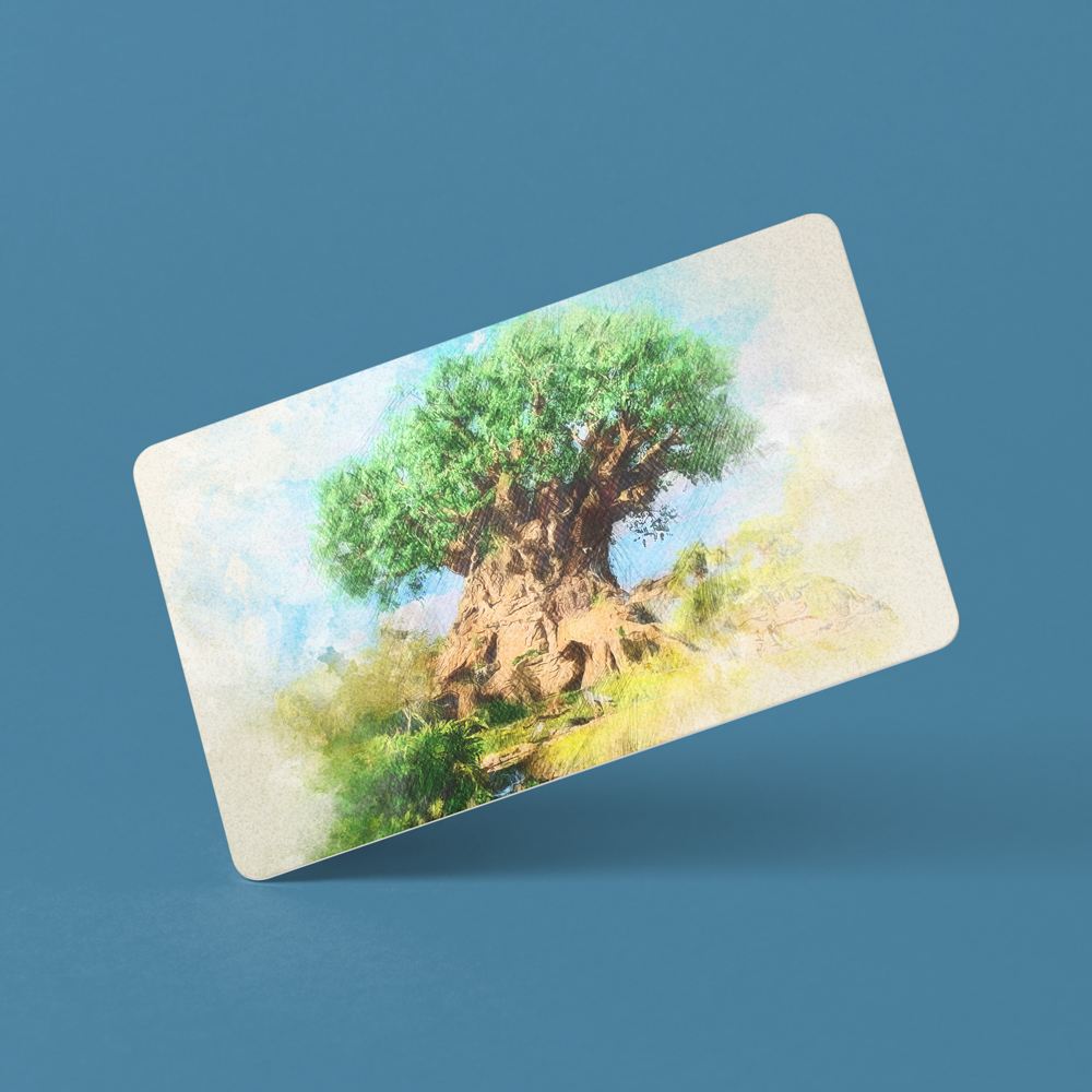 This custom watercolor sketch artwork featuring Animal Kingdom is printed in full-color on a plastic substrate the same size as a credit card and is mounted on a magnetic backing.