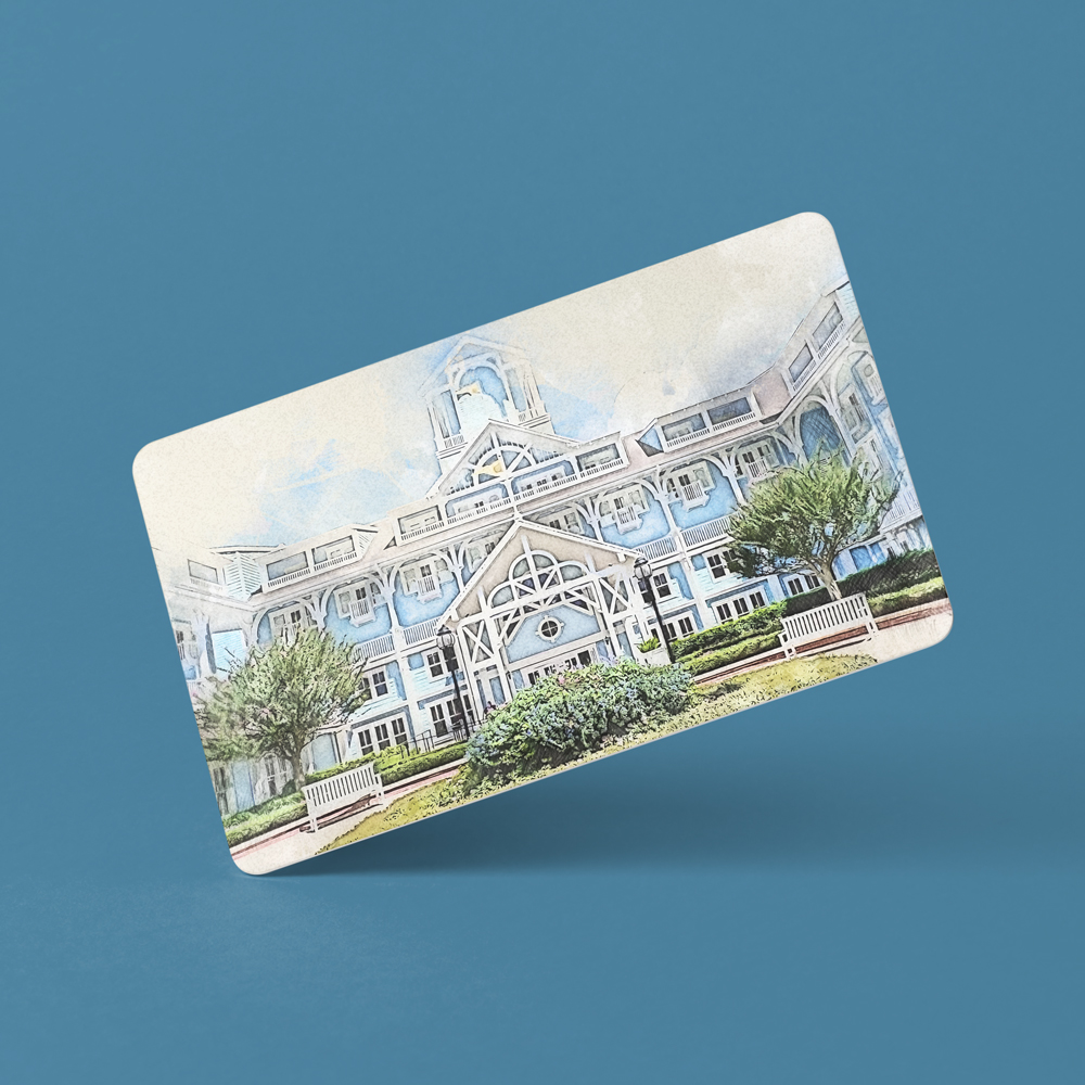 This custom watercolor sketch artwork featuring the Beach Club Resort is printed in full-color on a plastic substrate the same size as a credit card and is mounted on a magnetic backing.