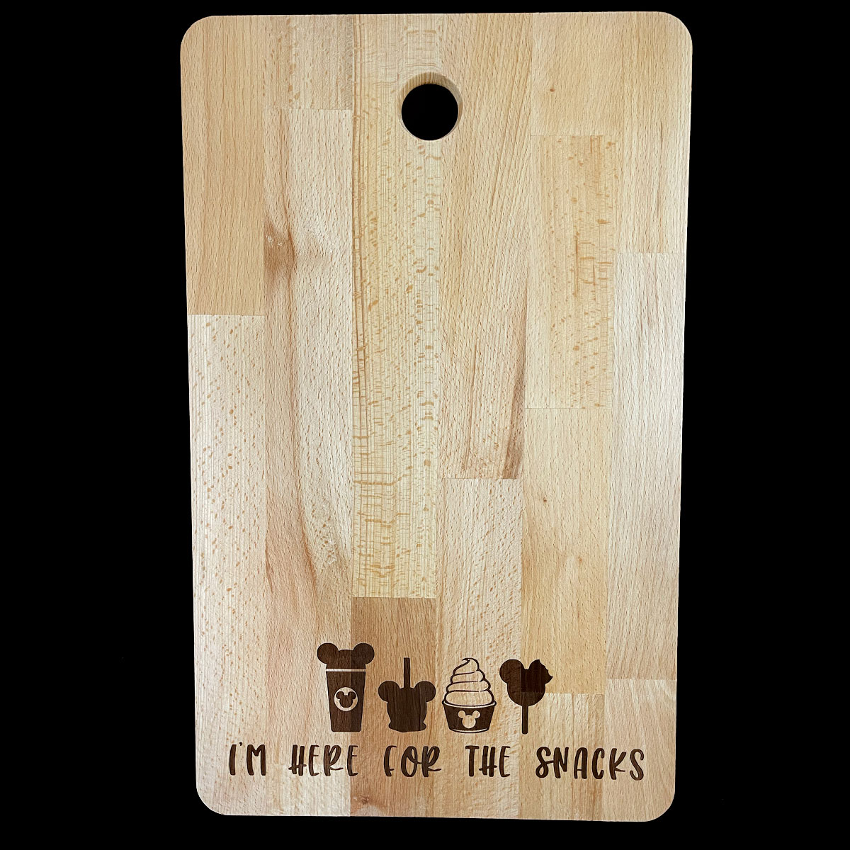 This large (11 x 18), all natural Beech cutting board is made from sustainable hardwood and is gentle on your knives. Also great for use as a charcuterie board. Features a convenient hole for carrying or hanging. The board is laser engraved with the your favorite snacks from Disney.