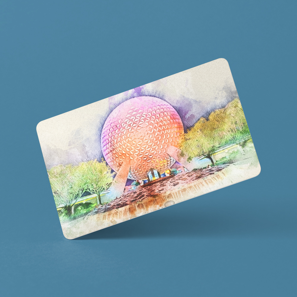 This custom watercolor sketch artwork featuring EPCOT at night is printed in full-color on a plastic substrate the same size as a credit card and is mounted on a magnetic backing.