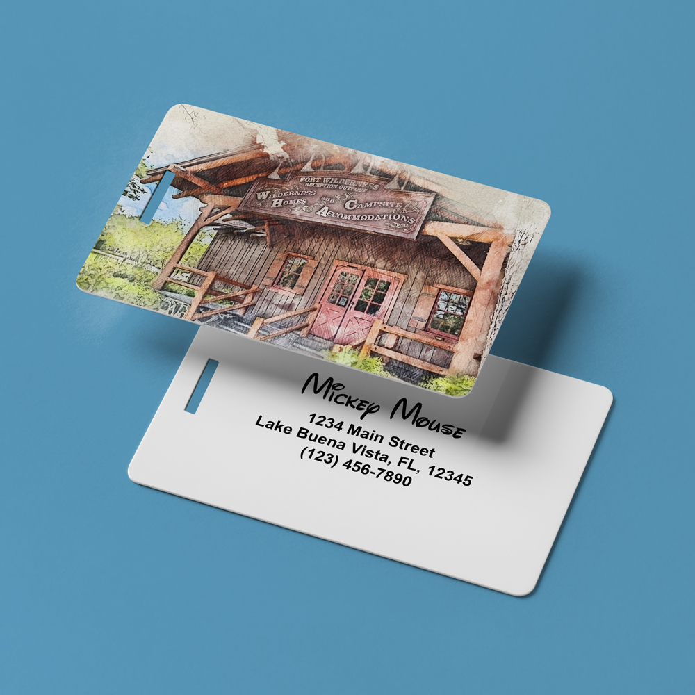 Featuring custom Fort Wilderness artwork, this heavy-duty, full-color printed plastic luggage tag—the same size and weight of a credit card—will serve you for years to come. Includes customization with your name, address, and phone number.