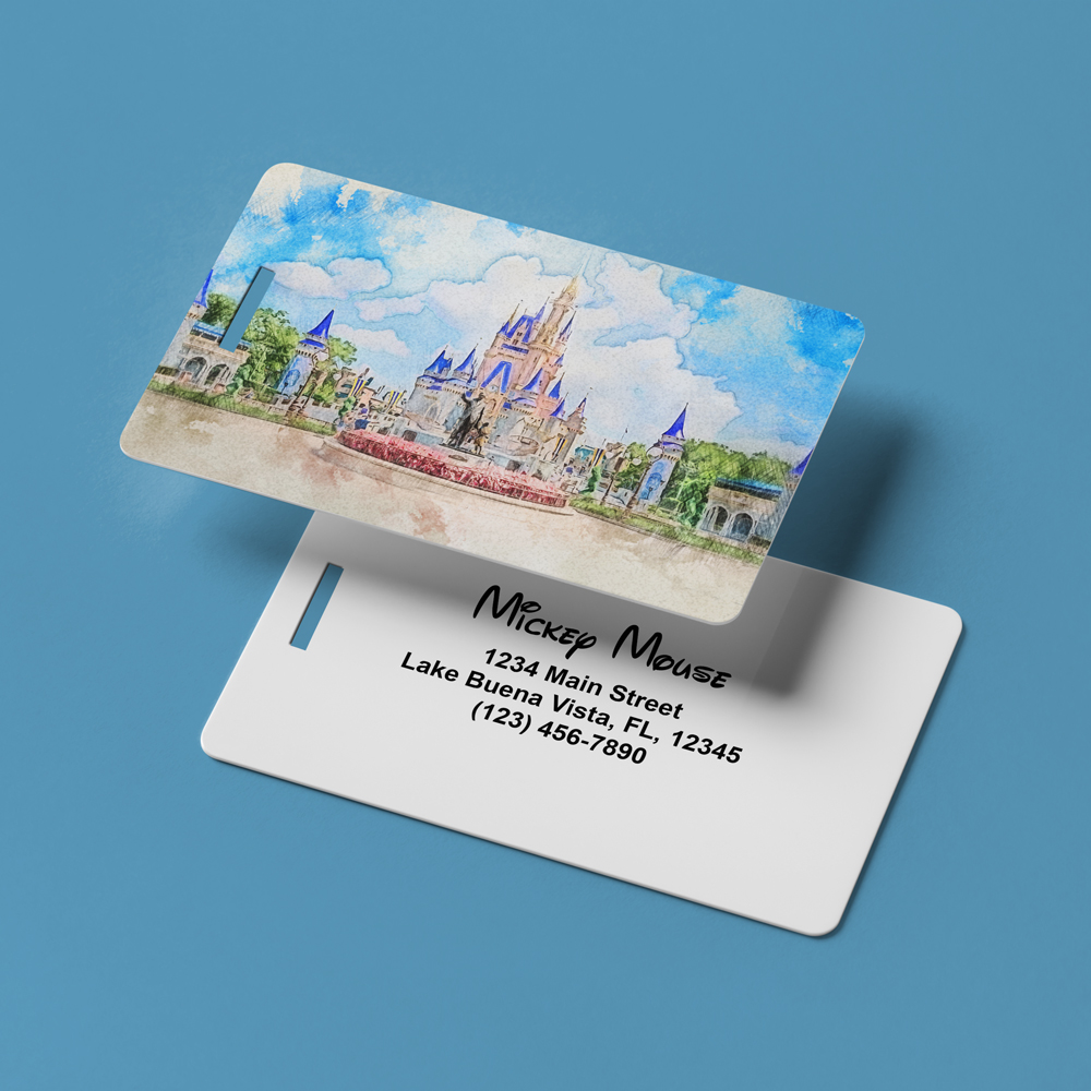 Featuring custom Magic Kingdom artwork, this heavy-duty, full-color printed plastic luggage tag—the same size and weight of a credit card—will serve you for years to come. Includes customization with your name, address, and phone number.