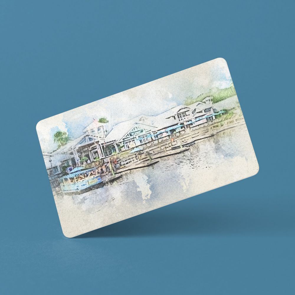 This custom watercolor sketch artwork featuring the Old Key West Resort is printed in full-color on a plastic substrate the same size as a credit card and is mounted on a magnetic backing.
