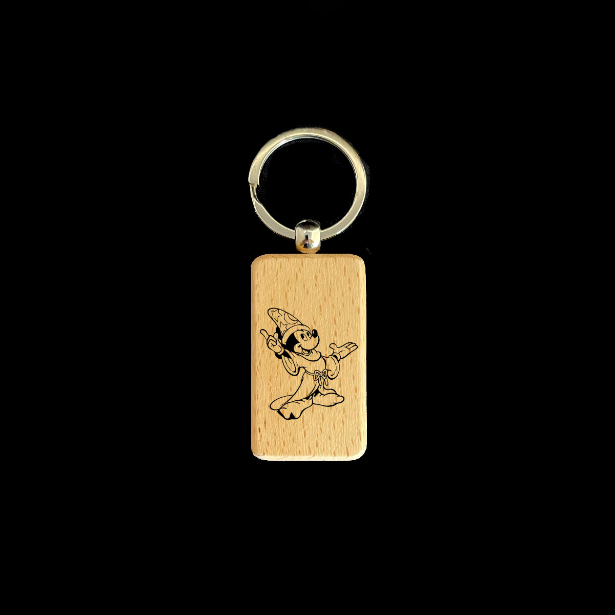 Show off your love for Sorcerer Mickey with this all natural, smooth wooden rounded rectangle approximately 1.2 x 2.1 inches, with a 1.2 inch split metal keyring.